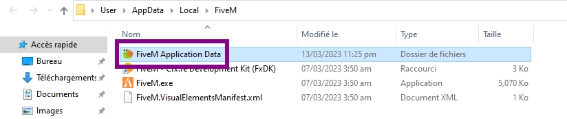 Allez dans le dossier « FiveM Application Data » (celui avec l'icône d'un escargot vert et orange). Sinon, allez à l'aide de l'explorateur Windows sur le chemin suivant : "C:\Users[nom d'utilisateur]\AppData\Local\FiveM" (remplacez [nom d'utilisateur] par votre nom d'utilisateur Windows).