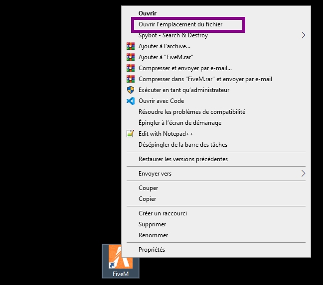 Sur l'icône FiveM sur votre bureau Windows, faites un clic droit et sélectionnez « Ouvrir l'emplacement du fichier ».